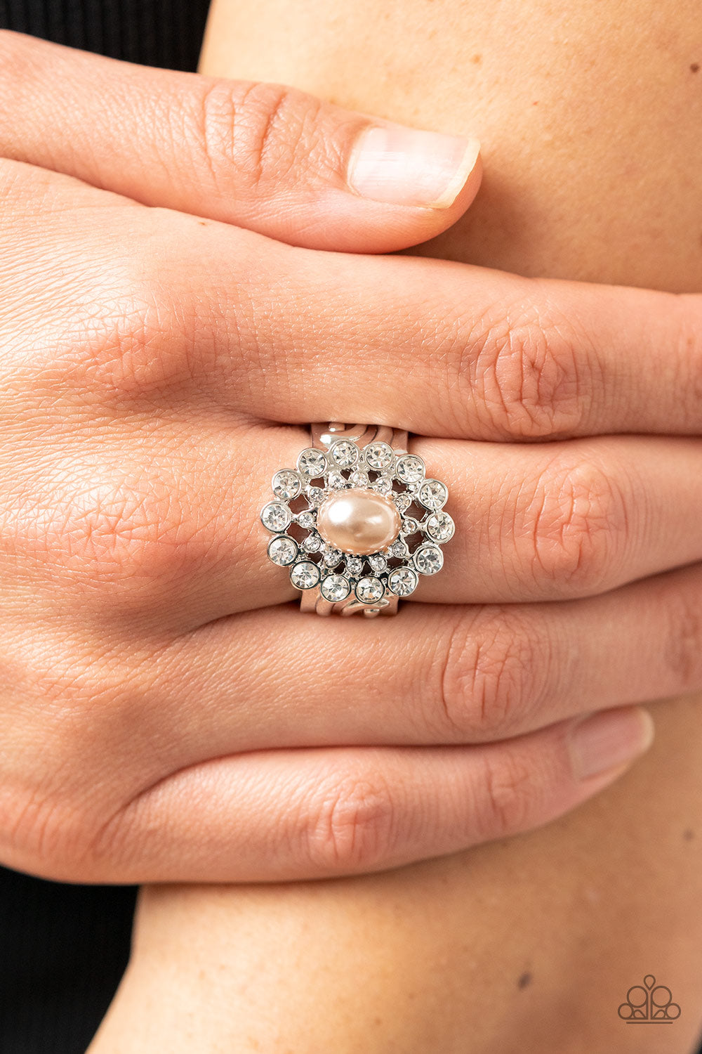 Two rings of sparkly white rhinestones radiate out from an oval brown pearl center, resulting in a radiant centerpiece atop the finger. Features a stretchy band for a flexible fit.