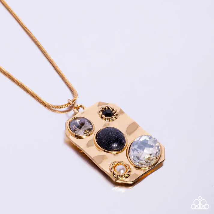 Gliding along a dainty gold snake chain, a hammered rectangular gold pendant features a collection of eclectic shimmer including white round and oval gems, a white pearl in a textured wreath, a black rhinestone in the same textured wreath, and a gold-flecked black bead. Features an adjustable clasp closure.