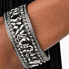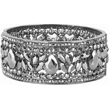 A smoldering collection of oversized teardrop and marquise cut hematite rhinestones haphazardly coalesce between linear stacked rows of round hematite rhinestones. The dazzling hematite spangled gunmetal frames regally connect around the wrist, creating a bold bangle-like cuff. Features an adjustable hinged closure.