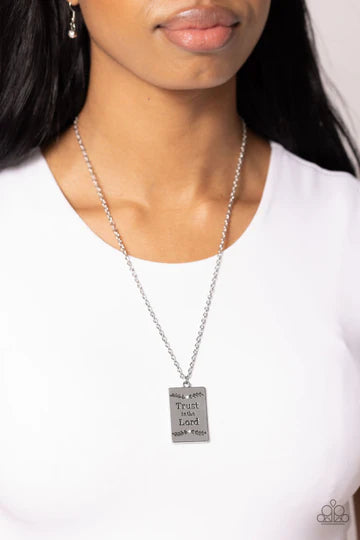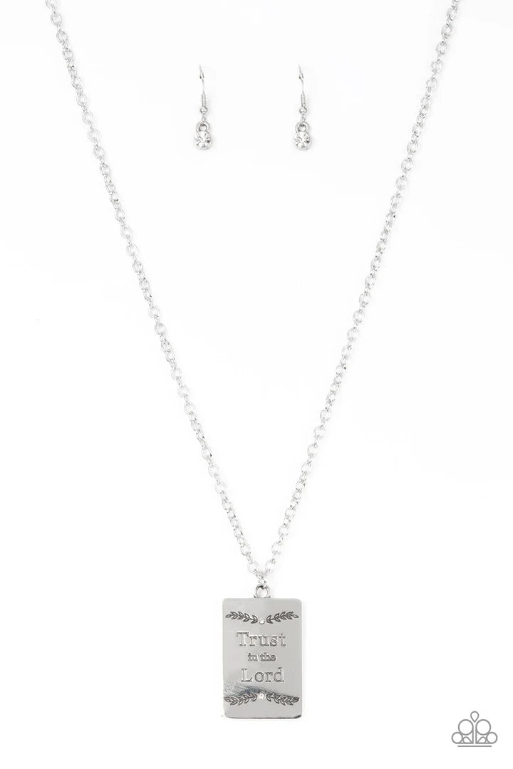 Bordered in leafy patterns and dainty white rhinestones, the center of a silver rectangular frame is stamped in the phrase, "Trust in the Lord," for an inspiring finish. Features an adjustable clasp closure.