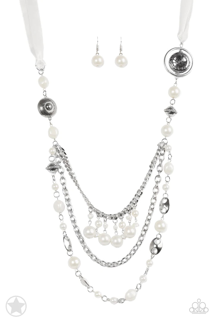 A silky ivory ribbon replaces a traditional chain to create an elegant look. Pearly ivory beads and funky silver pieces intermix with varying lengths of silver chains to give a fresh take on a Victorian-inspired piece. Sold as one individual necklace. Includes one pair of matching earrings.