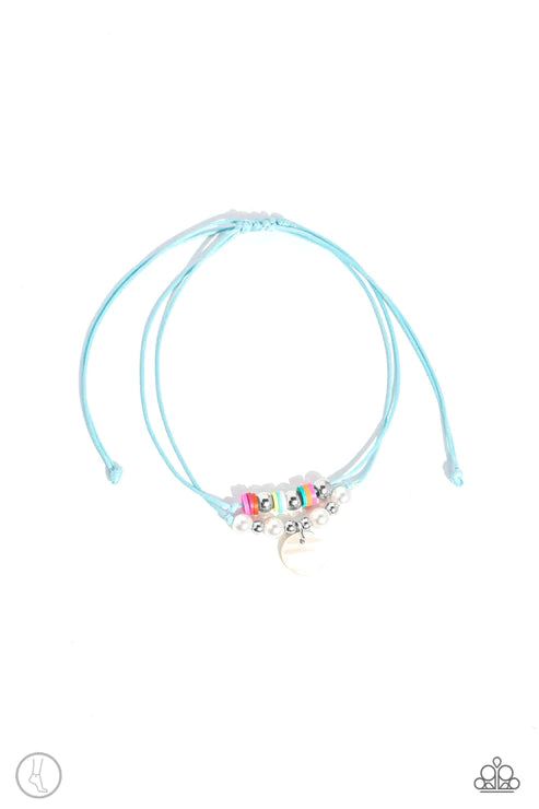 Infused along a light blue string, a coastal collection of pearls, silver studs, multicolored clay discs, and a flat white shell wrap around the ankle for a colorful, seasonal statement. Features an adjustable sliding knot closure.