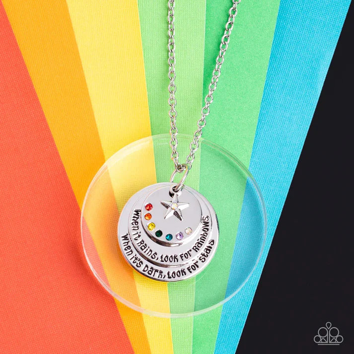 Dotted in a rainbow of dainty rhinestones, a shiny silver disc sits atop two overlapping silver discs that gradually increase in size. The bottom of the centermost disc is engraved in the phrase, "When it rains, look for rainbows," and continues with "When it's dark, look for stars" along the bottom of the final disc. Dotted with a dainty iridescent rhinestone, a shiny silver star tops off the layered the pendant, invoking an inspirational sentiment. Features an adjustable clasp closure.