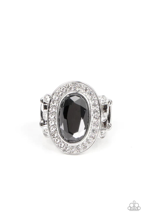 An oversized oval smoky gem is pressed into the center of a white rhinestone encrusted silver frame atop white rhinestone dotted silver bands, creating a glamorous centerpiece atop the finger. Features a stretchy band for a flexible fit.