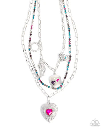 A trio of layered silver chains featuring unique textures, including sleek links and a strand of multicolored rhinestones, creates a statement around the neck. Dangling charms, such as a white rhinestone encrusted ring, an angel wing with white rhinestones on its upper half, a smooth silver disc with colorful gems pressed in its front, and a dainty silver floral charm with a blue rhinestone center, add an element of playful sophistication. A stripe-textured heart dangles from the lowermost chain, with a brilliant pink heart gem in its center with dainty white rhinestones around its border. Features an adjustable clasp closure.