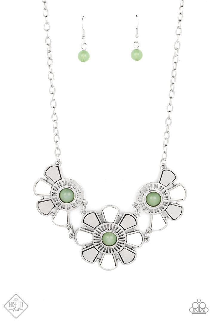 Dotted with milky bead centers in the Pantone® of Basil, silver and white shell-like petals fan out from an airy metal frame. The trio of whimsically industrial flowers connects to a conventional silver chain below the collar resulting in an unabashedly metropolitan display. Features an adjustable clasp closure.