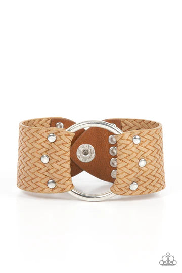 An oversized silver ring is studded in place across the center of the wrist between two pieces of textured brown leather bands, resulting in a rustic centerpiece around the wrist. Features an adjustable snap closure.