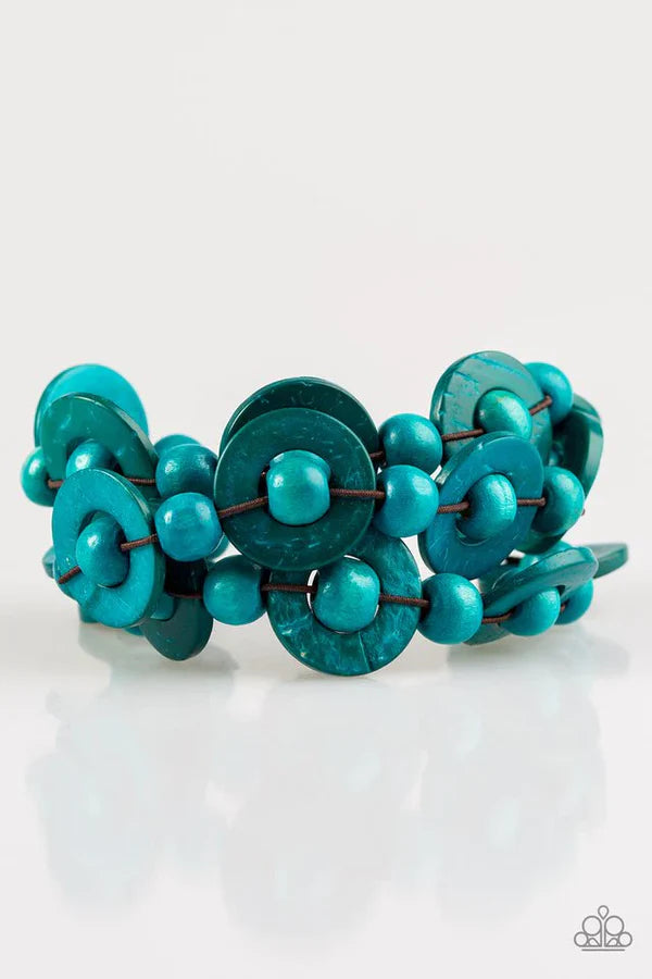 Brushed in refreshing blue finishes, wooden rings and beads are knotted in place along three stretchy strands, creating summery layers around the wrist. Features a button loop closure. Sold as one individual bracelet.