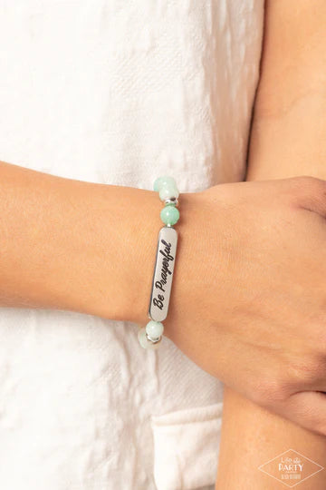 Infused with dainty silver accents, a collection of glassy green stone beads and a shimmery silver frame stamped in the phrase, "Be Prayerful", are threaded along a stretchy band around the wrist for an inspirational look. As the stone elements in this piece are natural, some color variation is normal. Sold as one individual bracelet.