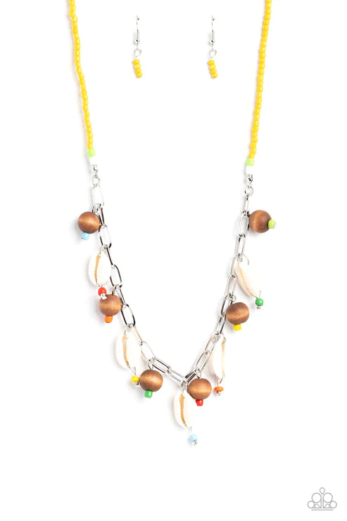 Vibrant yellow, green, and white seed beads connect to a silver link chain. Dangling along the silver links, wooden beads and cowrie shells alternate for a beach-inspired statement. Multicolored seed beads dangle just below each wooden bead and cowrie shell for additional charm. Features an adjustable clasp closure.