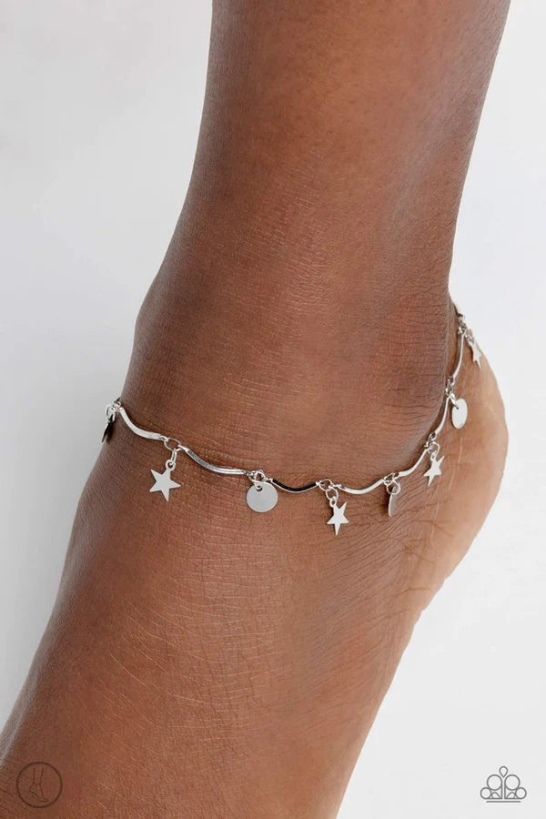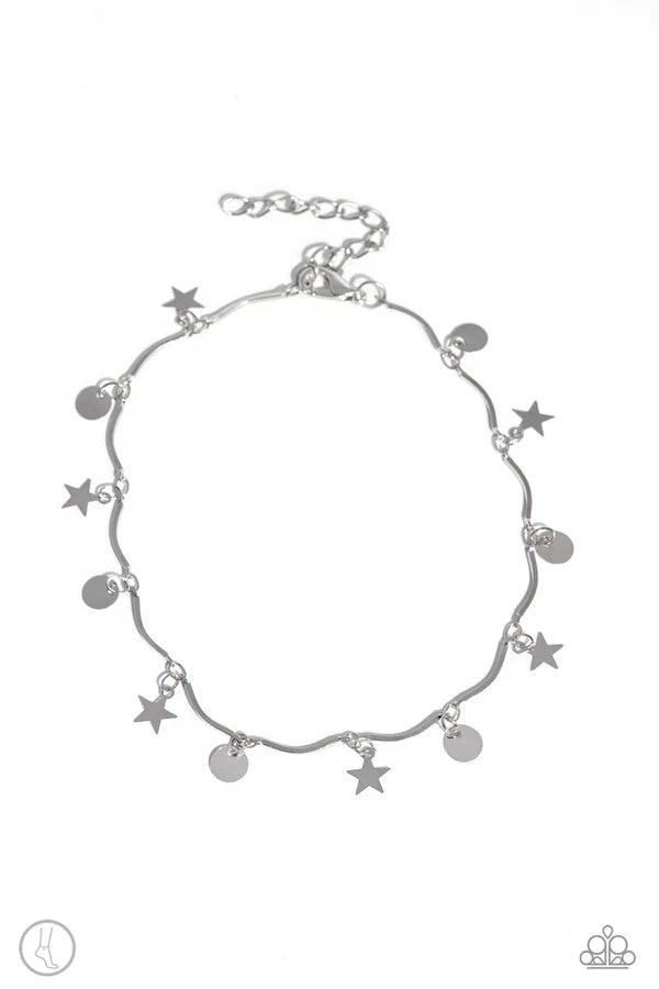 A fringe of sleek silver stars and discs swings from a dainty silver overlay chain, creating whimsical movement around the ankle. Features an adjustable clasp closure.
