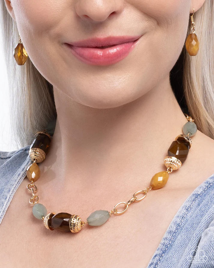 Connecting along a gold cable chain, a collection of textured gold cap fittings and chunky faceted beads in rich shades of amber, brown, and soft green cascade below the neckline, creating a perfect blend of natural beauty and bold sophistication. Features an adjustable clasp closure. Sold as one individual necklace. Includes one pair of matching earrings.
