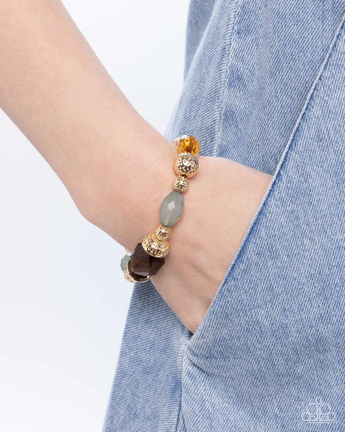 Infused along an elastic stretchy band, a collection of textured gold cap fittings, textured gold beads, and chunky faceted beads in rich shades of amber, brown, and soft green pattern along the wrist, creating a perfect blend of natural beauty and bold sophistication.
