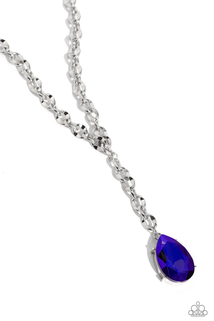Set in an elevated silver-pronged frame, a faceted purple teardrop gem cascades from an oblong, abstract silver ring chain that extends past the collar for a blinding statement. Features an adjustable clasp closure.