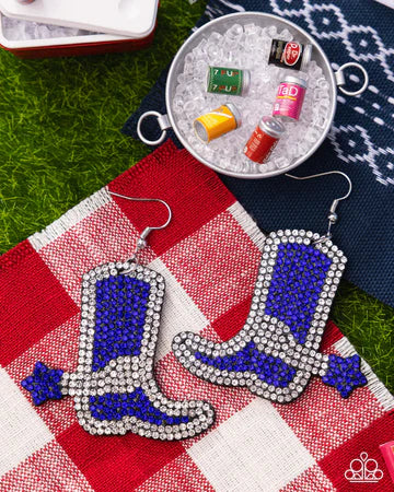 Dazzling blue and white rhinestones set in the shape of cowboy boots, complete with a spurred design for a whimsical Western touch, sway playfully from the ear. Earring attaches to a standard fishhook fitting.