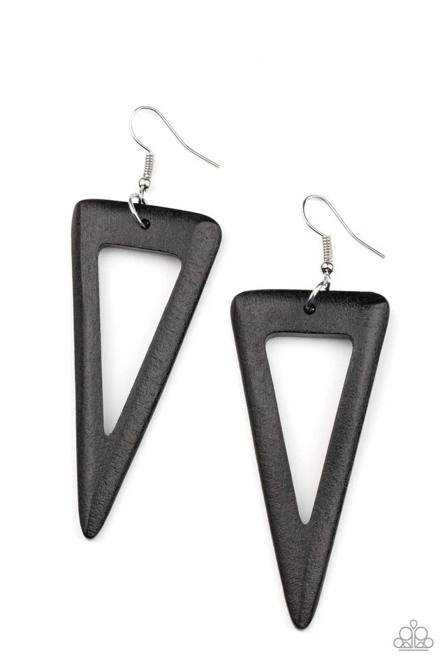 Enhance your style with these fierce Bermuda Backpacker earrings. The sharp triangular wooden frame in shiny black exudes an earthy vibe. These earrings attach easily with a standard fishhook fitting. Perfect for any occasion, these earrings will make a statement wherever you go.