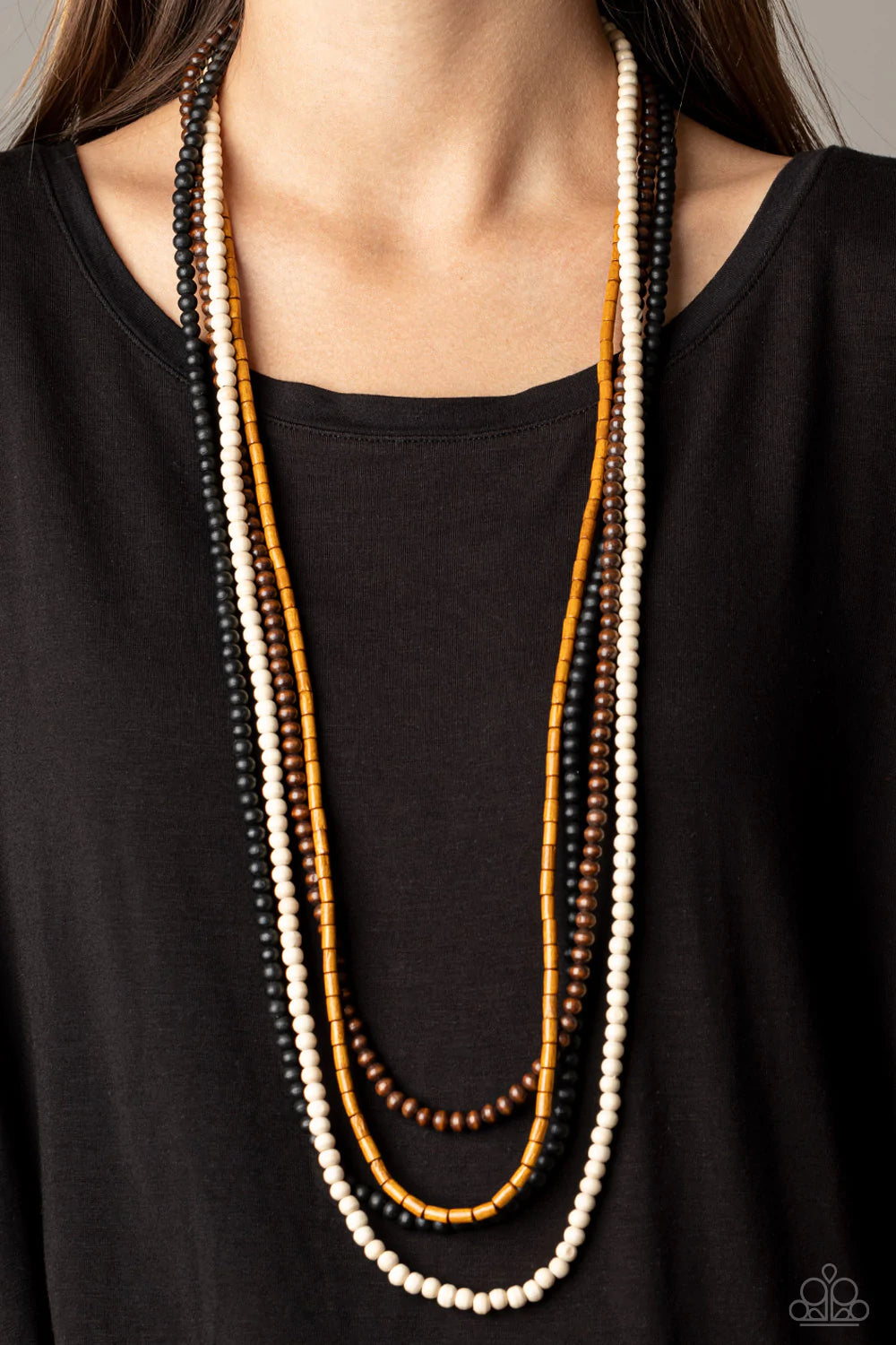 Featuring round and cylindrical shapes, mismatched strands of black, brown, tan, and white wooden beads drape across the chest for a summery look. Features an adjustable clasp closure.