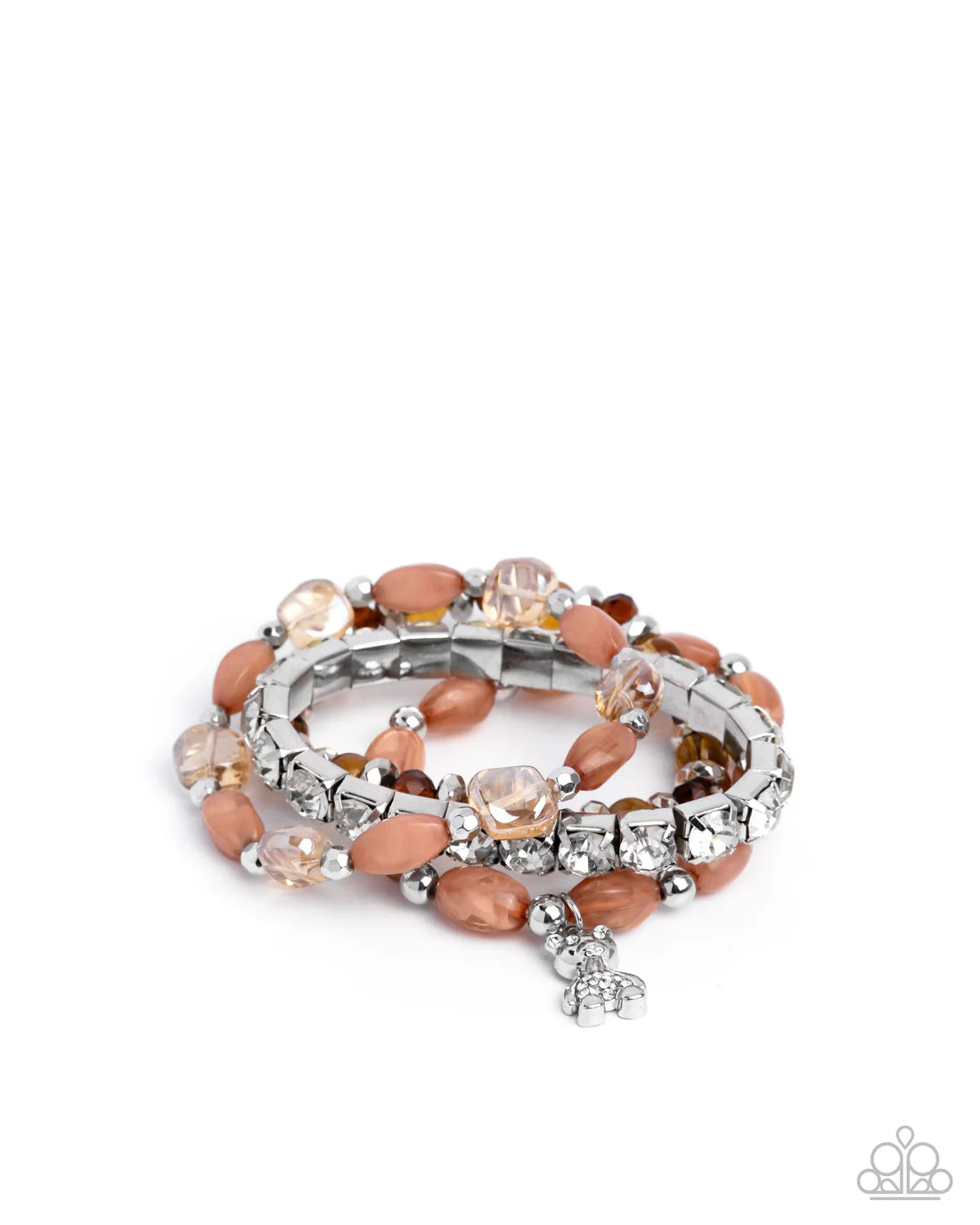 Threaded along invisible stretchy bands, a collection of faceted silver beads, white rhinestones in silver square fittings, multicolored brown faceted beads, Bran cylindrical acrylics, chiseled brown transparent acrylics, and a white rhinestone-dusted teddy bear pattern and layer along the wrist.