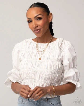 A quartet of mismatched gold chains, including dainty, abstract, paperclip, and dainty box chains layer around the wrist to create a refined display. Adorning the dainty uppermost strand, thin gold cylinder beads join white shell discs and Buckthorn Brown stone discs that alternate and are infused along the abstract gold chain for a blend of badlands-inspired color and attitude. Features an adjustable clasp closure. As the stone elements in this piece are natural, some color variation is normal.