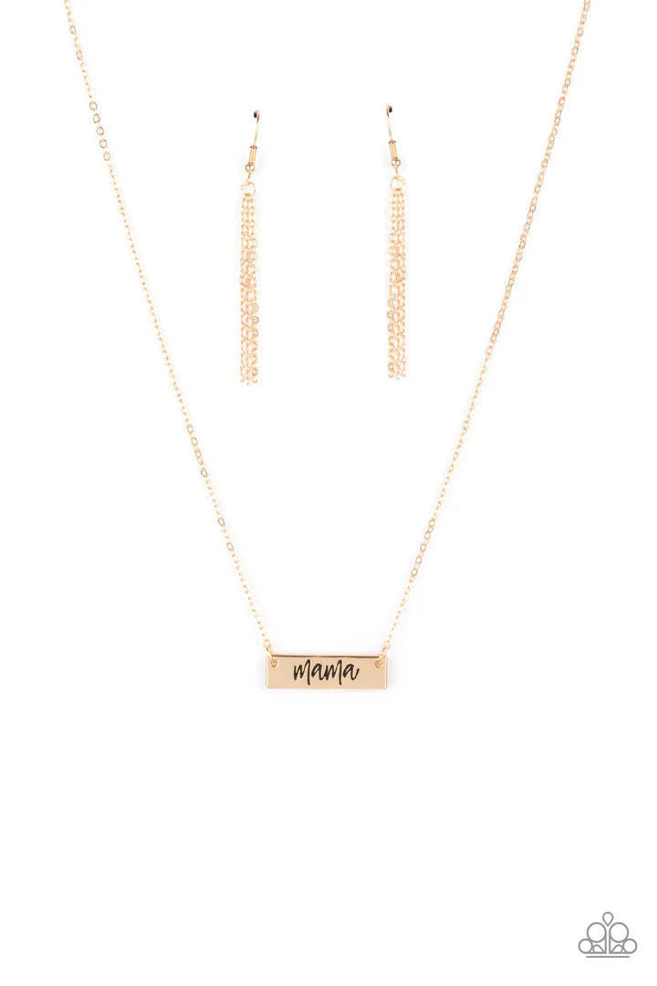 Stamped in the word, "Mama," a rectangular gold plate is suspended below the collar by a dainty gold chain, creating a whimsy inspirational pendant. Features an adjustable clasp closure. Sold as one individual necklace. Includes one pair of matching earrings.