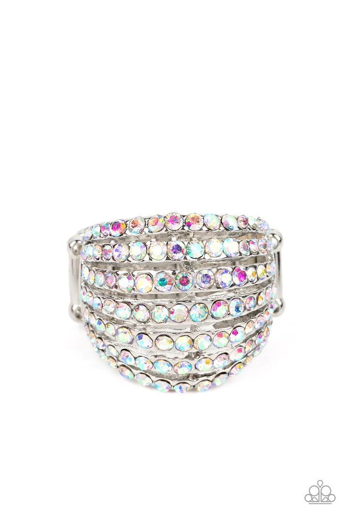 Row after row of iridescent rhinestones stack into a dazzling display. The gorgeous rounded bands and undeniable sparkle create a regal statement piece. Features a stretchy band for a flexible fit.