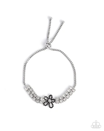 Pronged in silver square fittings, a collection of white gems creates a dazzling stacked row atop a silver box chain along the wrist. A white rhinestone-centered flower with petals made of black rhinestones blooms from the center of the stacked rows for a floral finish. Features an adjustable sliding knot closure.