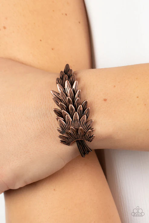 Feathery copper frames delicately overlap across the center of the wrist, creating a boa-like centerpiece atop rows of rustic copper chains. Features an adjustable clasp closure.