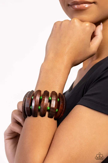 Pairs of energetic green wooden beads and oversized brown wooden frames alternate along stretchy bands around the wrist for a seasonal pop of color.