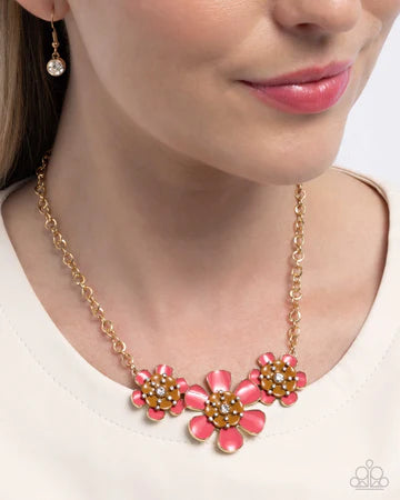 Connecting along a gold-linked chain, a trio of Desert Rose-painted gold flowers with a three-dimensional layered Buckthorn Brown flower atop it in blooms below the neckline in varying sizes for a whimsical look. White rhinestones stack and stream out from a white gem center atop the Buckthorn Brown flowers for a shimmery finish. Features an adjustable clasp closure. Sold as one individual necklace. Includes one pair of matching earrings.