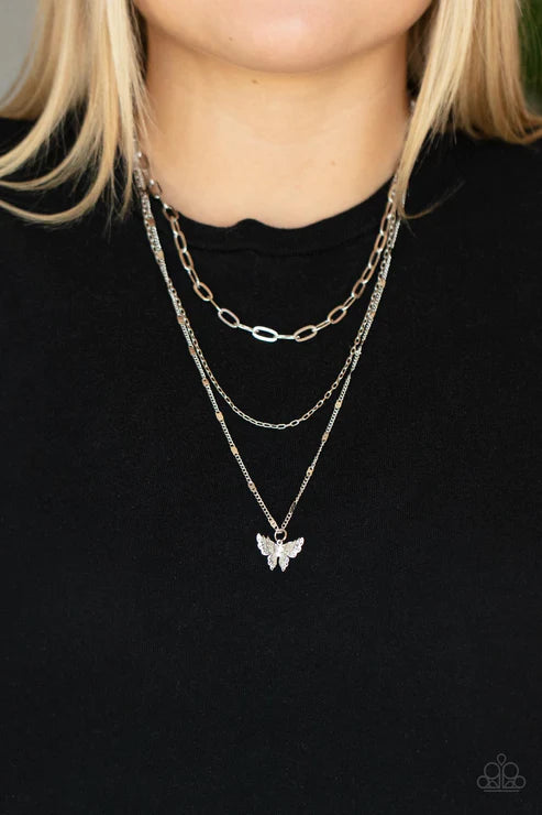 Dotted with a dainty white rhinestone, a decoratively layered silver butterfly swings from the bottom of a display of mismatched silver chains for a whimsically fluttering fashion. Features an adjustable clasp closure.