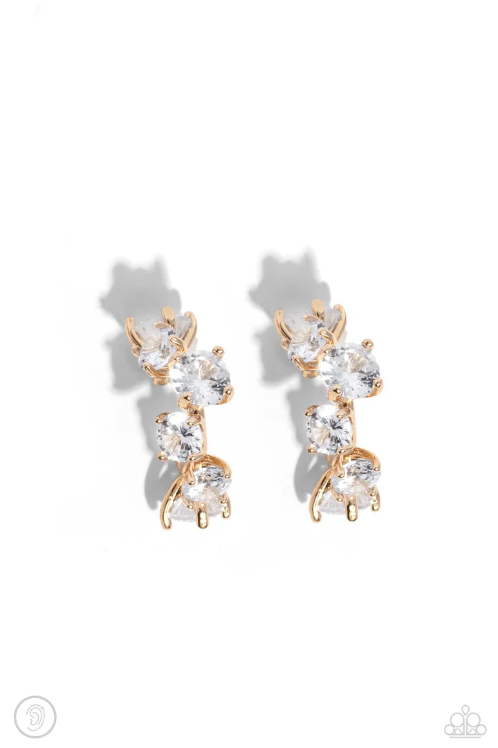 Fluttering atop pronged gold fittings, various faceted white gems glisten from the ear. Features a smooth surface for sliding ability to desired position on the ear. Due to its structure, adjusting capability is limited.