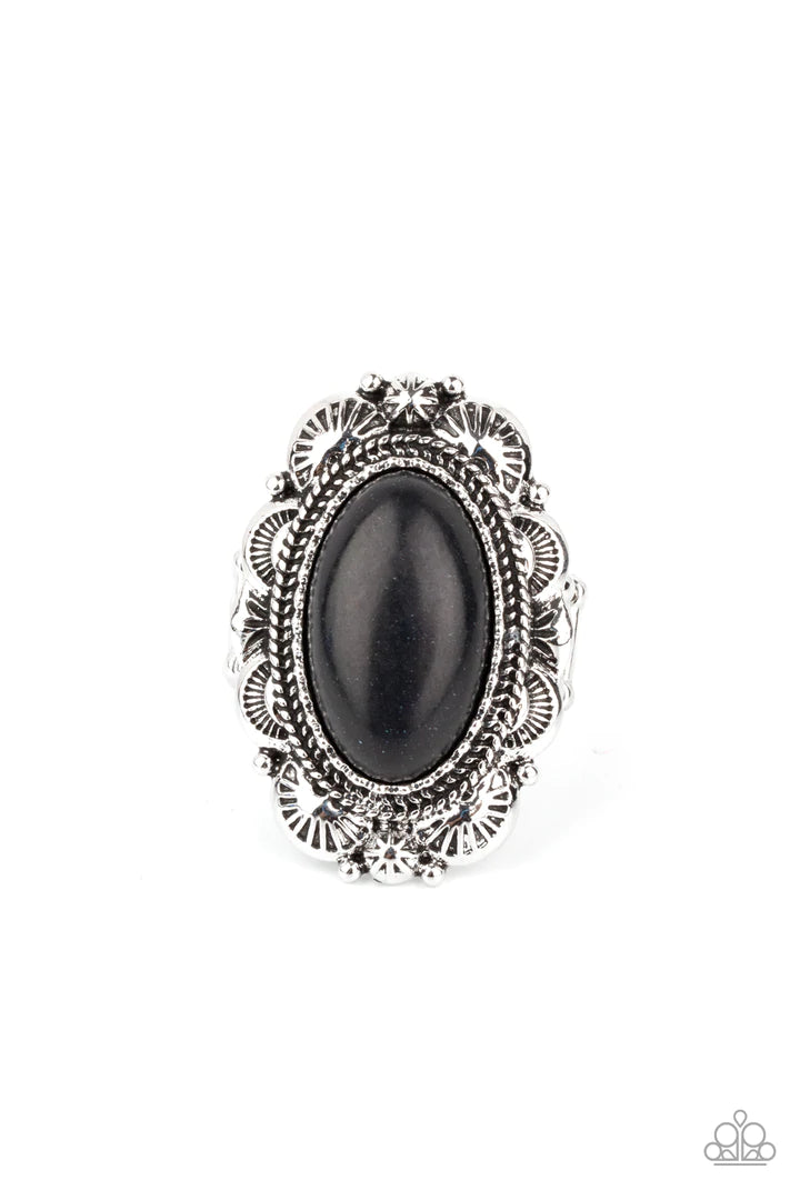 An oval black stone sits atop a scalloped silver frame decoratively embossed and stamped in rustic patterns, creating a whimsical stone centerpiece atop the finger. Features a stretchy band for a flexible fit.