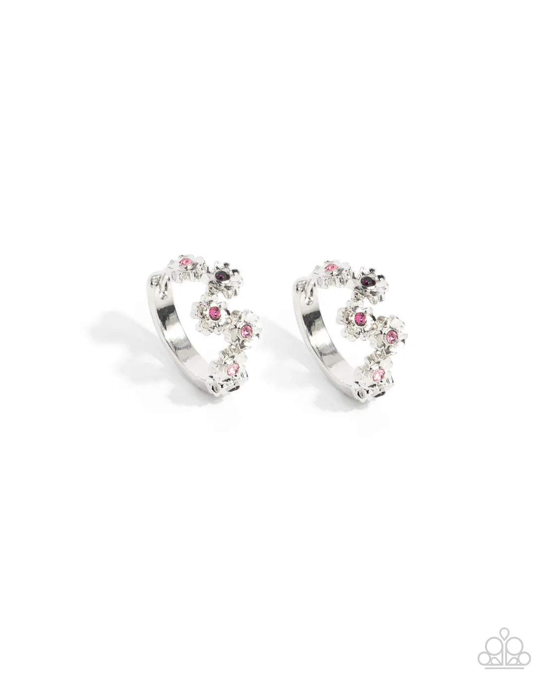 Dotted along the centers of textured silver flowers, a collection of purple multicolored rhinestones glisten close to the ear for a freestyling floral display. Earring attaches to a standard hinge closure fitting. Hoop measures approximately 3/4" in diameter.