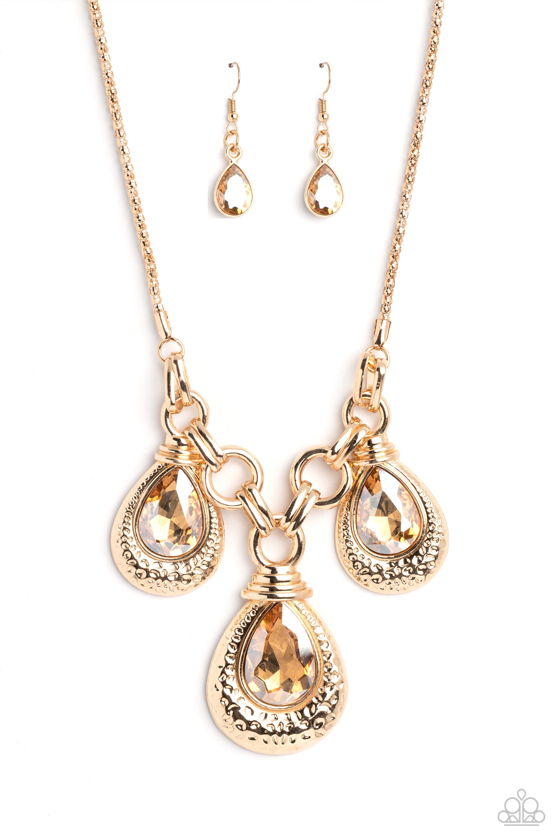 Oversized links of gold are artfully interlocked, laying the groundwork for a dynamic display of industrial grit. A trio of oversized champagne, faceted, teardrop gems drips from the chainlinks above, each set inside a textured gold frame topped with a stack of gold rings. The metallic mashup is suspended from a gold ball chain, introducing a hint of unexpected homespun character to the statement-making design. Features an adjustable clasp closure.