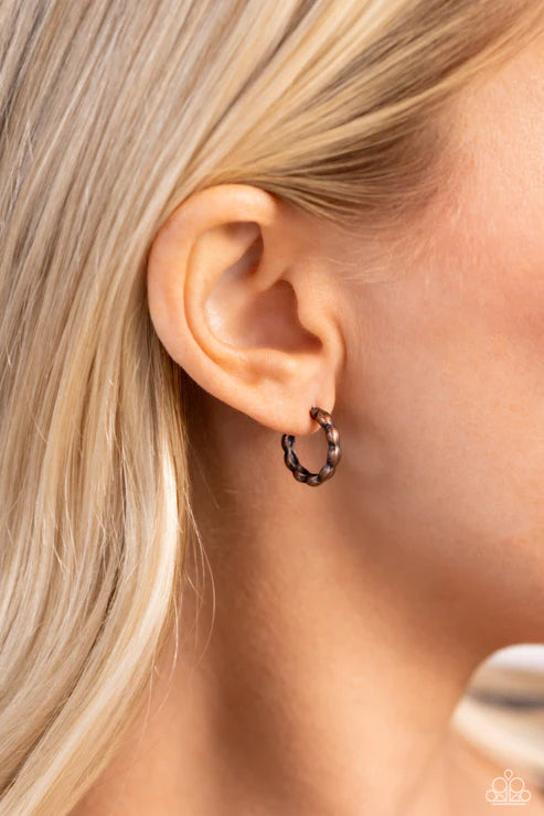 Complemented by its antiqued finish, textured ridges of copper daintily curve around the ear, creating a minimalistic, fashion statement. Earring attaches to a standard post fitting. Hoop measures approximately 1/2" in diameter.