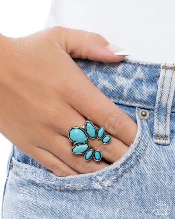 Set in silver frames, a collection of turquoise stones gradually increases in size from an oval to a marquise-cut to a teardrop, stacking along the finger in a horseshoe-inspired centerpiece for a Southwestern seasonal centerpiece. Features a stretchy band for a flexible fit. As the stone elements in this piece are natural, some color variation is normal.