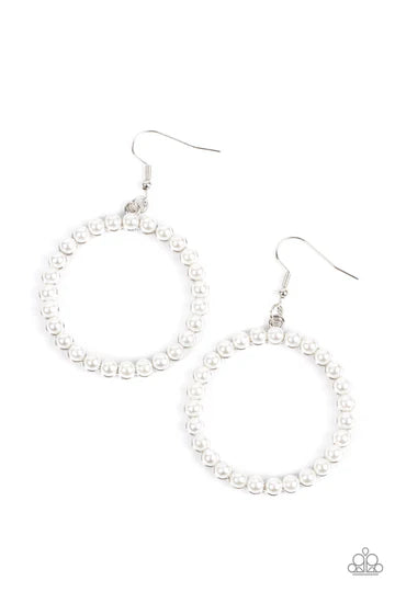 Bubbly white pearls adorn the front of a textured silver hoop, invoking a timeless fashion. Earring attaches to a standard fishhook fitting.