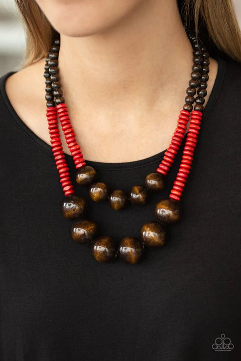 Earthy brown and fiery red wooden beads and discs are threaded along shiny strands of brown cording, creating colorful layers. Features a button loop closure. Sold as one individual necklace. Includes one pair of matching earrings.