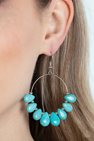 Imperfect turquoise teardrop stones alternate with dainty silver beads along a wire hoop, resulting in an adventurous fringe. Earring attaches to a standard fishhook fitting.