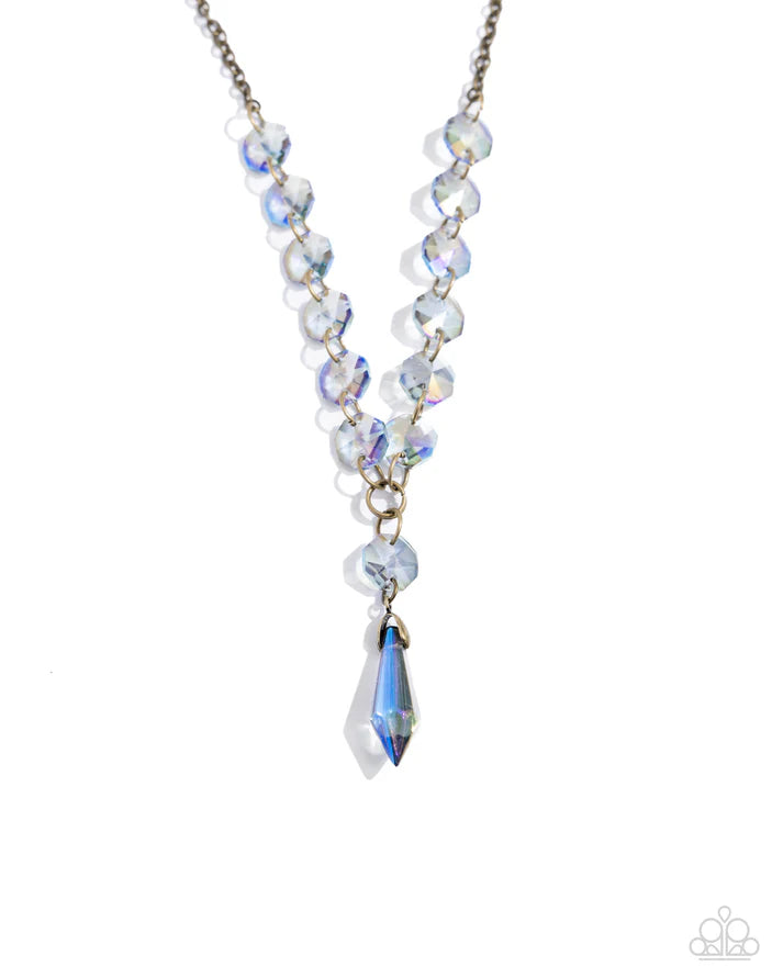 Featuring an opalescent, UV shimmer, faceted beads flicker and flash along a brass chain as it extends below the neckline, leading the eye to a faceted, prismatic bead for a finishing touch of shimmer. Features an adjustable clasp closure. Due to its prismatic palette, color may vary.