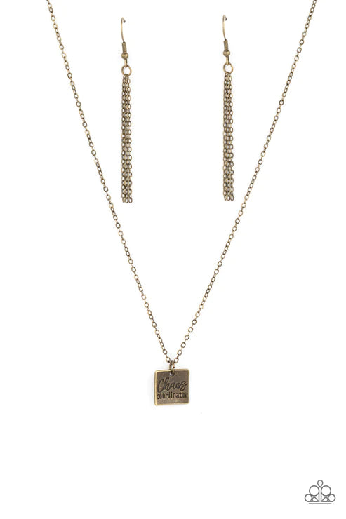 A curved brass square engraved with the words "Chaos Coordinator" dangles from a brass chain creating a playful medallion below the collar. Features an adjustable clasp closure.