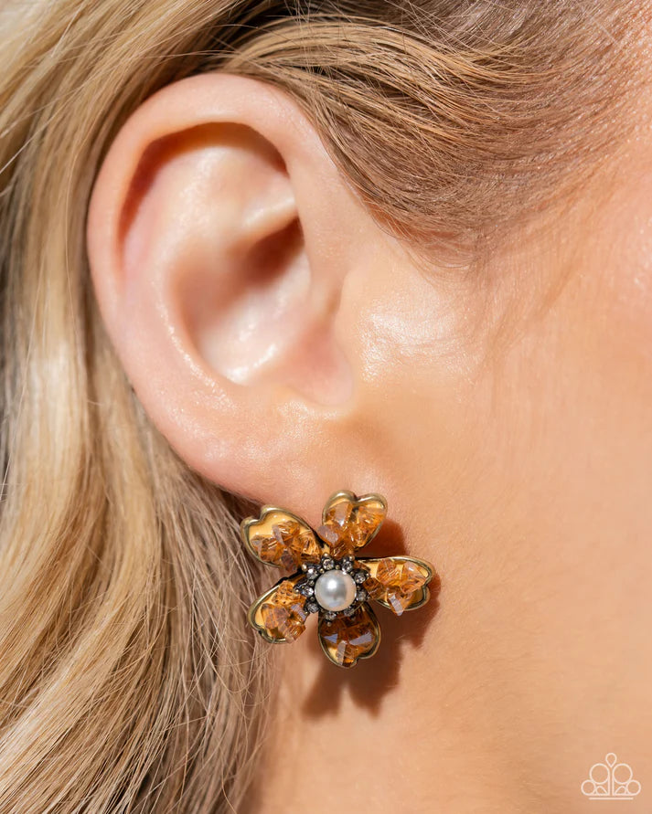 Brass petals are dotted with topaz pieces surrounding a rhinestone embellished pearl studded center. Sold as one pair of post earrings.