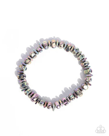 Infused along an elastic stretchy band, a collection of pink iridescent-brushed pebbles alternates with oil spill chiseled beads along the wrist for a uniquely urban statement. Due to its prismatic palette, color may vary.