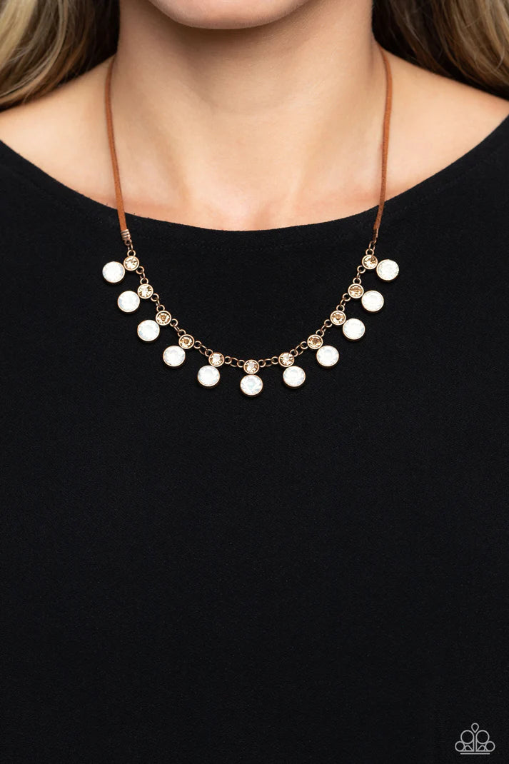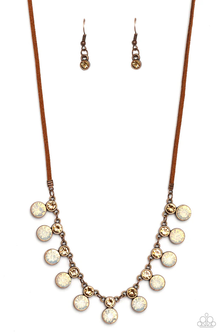 A collection of oversized, opalescent rhinestones, set in copper frames attaches to a collection of topaz rhinestones set in similar frames. Strung along a copper chain, the sparkly collection attaches to a strand of brown suede for a free-spirited finish around the neckline. Features an adjustable clasp closure.