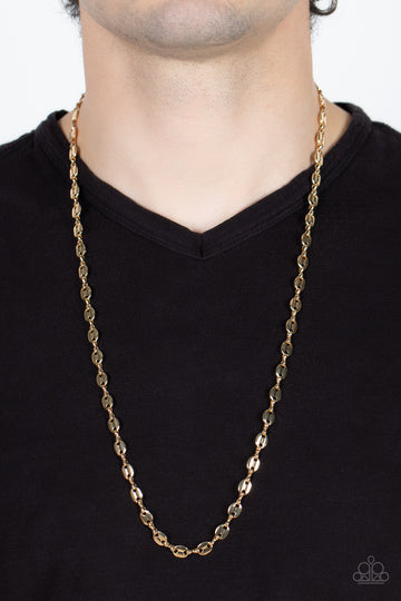 Gold infinity links boldly connect with beveled oval discs, creating an intense industrial chain across the chest. Features an adjustable clasp closure.