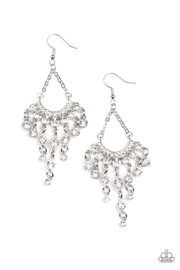 Two rows of sparkly white rhinestones fan out from the bottom of two dainty silver chains. Twinkly tassels of white rhinestones stream out from the bottom of the glimmering frame, creating a timeless chandelier. Earring attaches to a standard fishhook fitting.