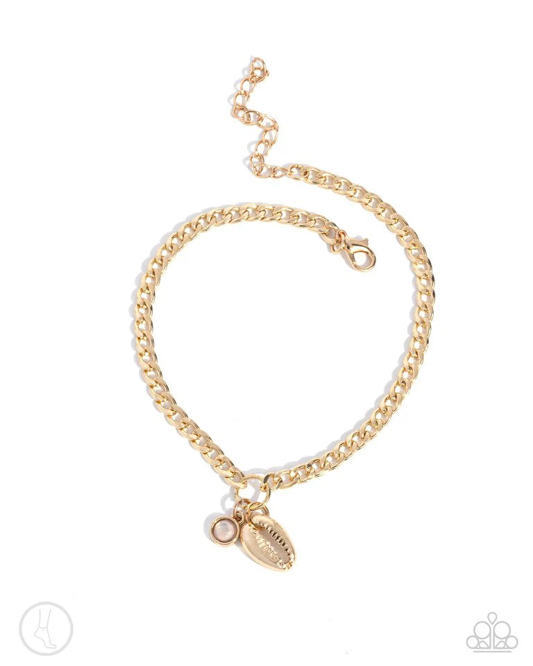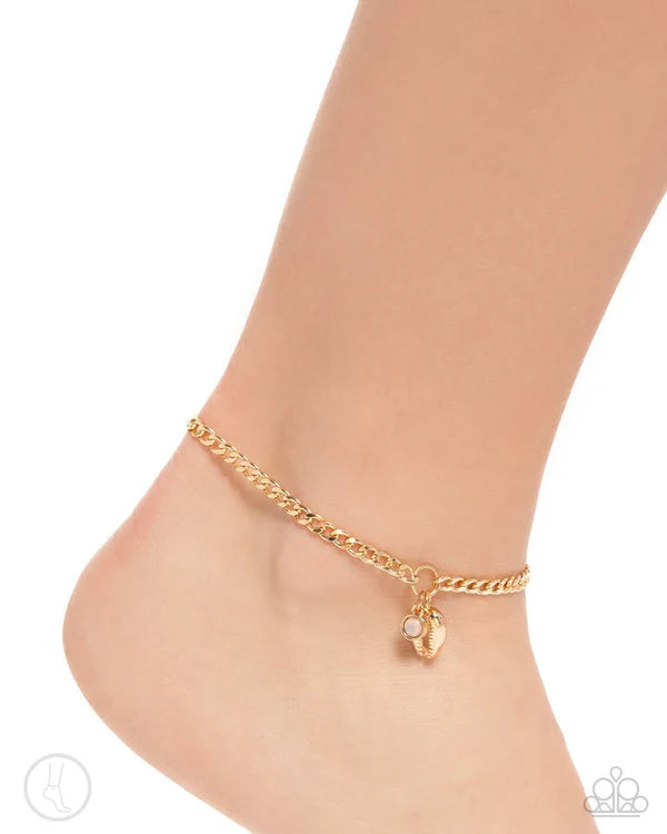 Attached to a gold ring, an opalescent pink bead, and a gold conch shell swing from a gold curb chain around the ankle for a charming, coastal centerpiece. Features an adjustable clasp closure.