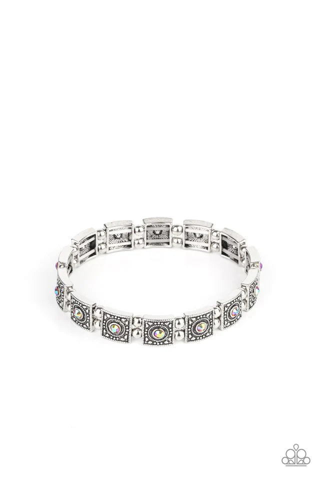Dotted with orangey iridescent rhinestone centers, studded silver frames alternate with pairs of dainty silver beads along stretchy bands, creating a stellar centerpiece around the wrist.