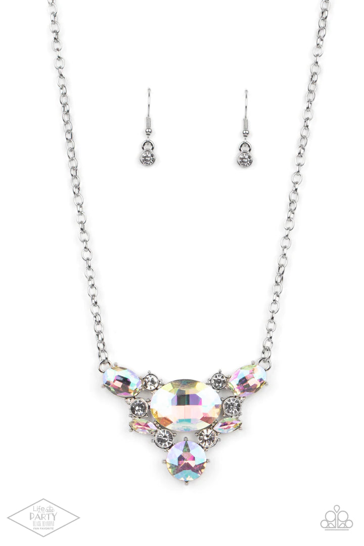 Featuring a UV shimmer, oversized iridescent gems and glassy white rhinestones delicately coalesce into a v-shaped pendant below the collar for over-the-top glamour. Features an adjustable clasp closure.
