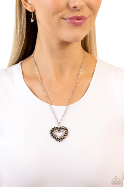 Featuring silver studded frames, smoky teardrop gems form into a glitzy heart pendant at the bottom of a dainty silver chain. White rhinestones border the inner heart frame, leaving an airy heart silhouette to glide down the chest for a flirtatiously colorful finish. Features an adjustable clasp closure.
